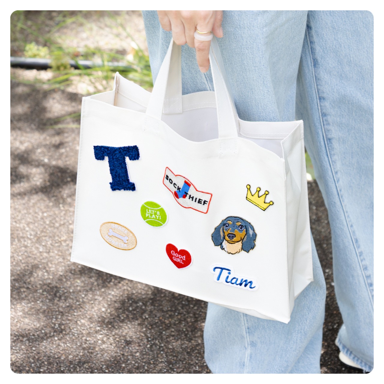 ティアミークの人気「うちのこ刺繍ワッペン」を、お散歩にぴったりのトートバッグにつけてお届けします。