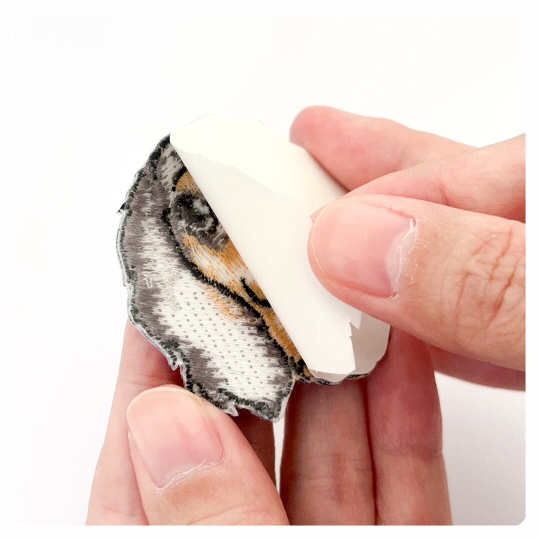 ③ワッペンの裏面のフィルムを剝がし、接着面を下にして、