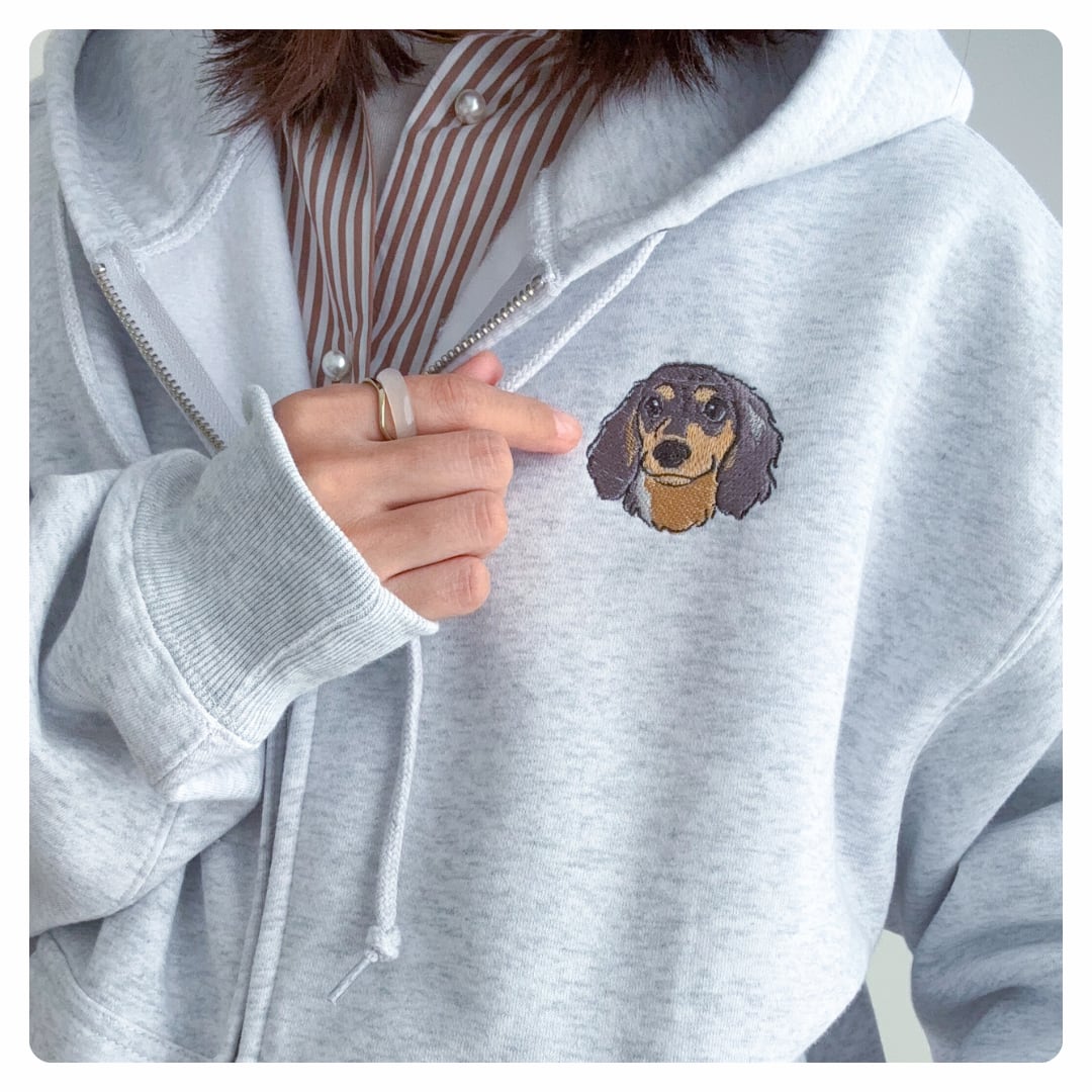 あなたの大切な家族である「うちの子」の似顔絵を左胸に刺繍して、トレンド感たっぷりのパーカーにお付けします。