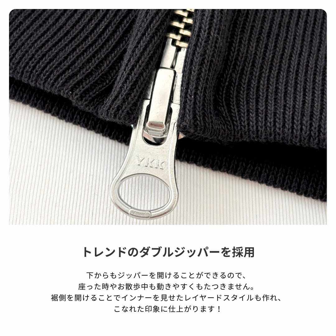 下のジップを少し開ければ、インナーを見せるレイヤードスタイルや、